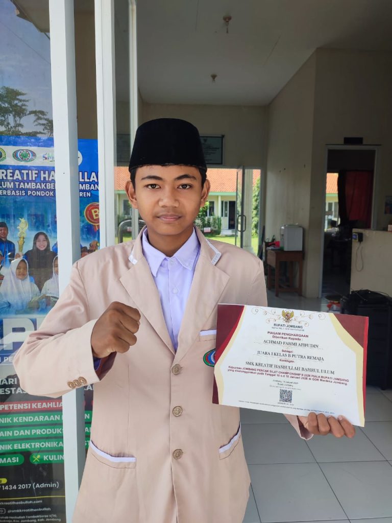 Jombang – SMK Kreatif Hasbullah Bahrul Ulum Tambakberas Jombang kembali menorehkan prestasi membanggakan melalui salah satu siswa yang bernama Achmad Fahmi Afifudin. Siswa kelas X Jurusan Teknik Kendaraan Ringan (TKR) tersebut berhasil meraih Juara 1 Kelas B Putra Remaja dalam ajang Pencak Silat Championship II 2026 Piala Bupati Jombang yang diselenggarakan pada 16–18 Januari 2026….